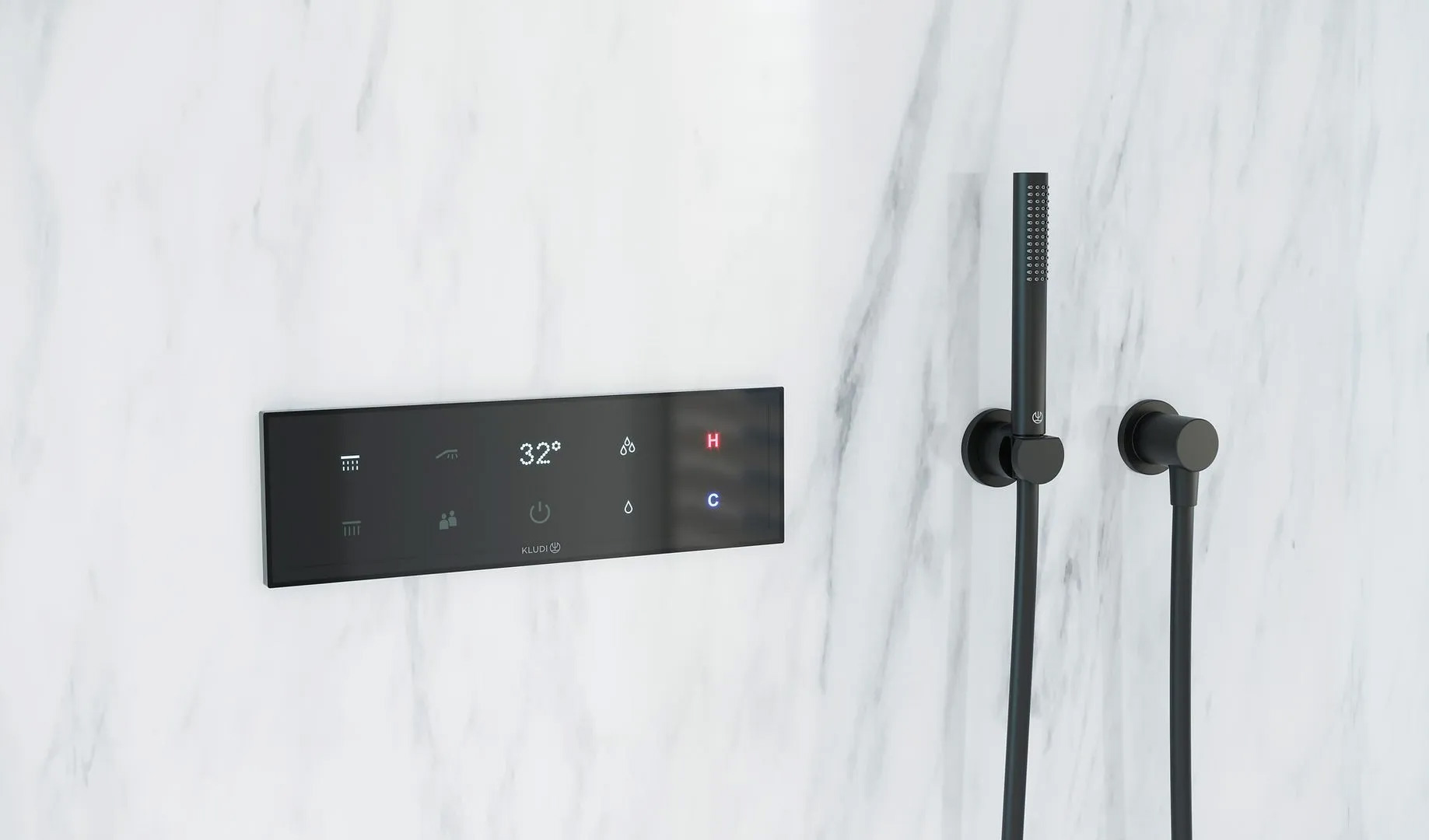 Ebenso elegant und auf das Wesentliche reduziert präsentiert sich das Design der Highend-Variante Kludi-TouchTronic. Gerade einmal 6,5 Millimeter hoch ist der Rahmen, in den die edle Bedienoberfläche aus schwarz getöntem Polycarbonat eingelassen ist. Leicht verständliche und gut erkennbare Symbole, die übersichtlich angeordnet sind, machen die Bedienung kinderleicht. Nach Anschalten des Displays können per Fingerdruck auf die entsprechenden Icons bis zu drei Verbraucher getrennt voneinander an- und ausgeschaltet werden. Dabei können zwei Brausen – etwa die Kopf- und Handbrause oder Schwall- und Regenstrahl der Kopfbrause gleichzeitig laufen. Über separate Bedienfelder lassen sich Temperatur und Durchflussmenge ganz nach Wunsch steuern. Eine Sperre sorgt allerdings dafür, dass die Temperatur auf maximal 44° Celsius begrenzt bleibt.